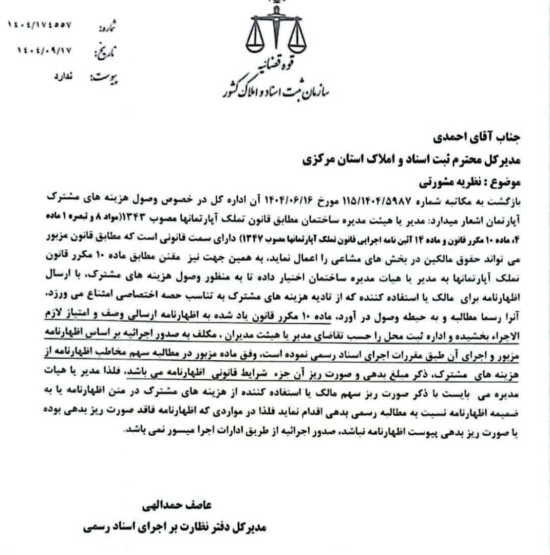 مدیر کل دفتر نظارت بر اجرای اسناد رسمی سازمان ثبت در جدیدترین نظریه مشورتی خود به شماره ١۴۰۴/١٧۴۵۵٧ مورخ ١۴۰۴/۰٩/١٧ به موضوع وصول هزینه های مشترک آپارتمان پرداخته است.